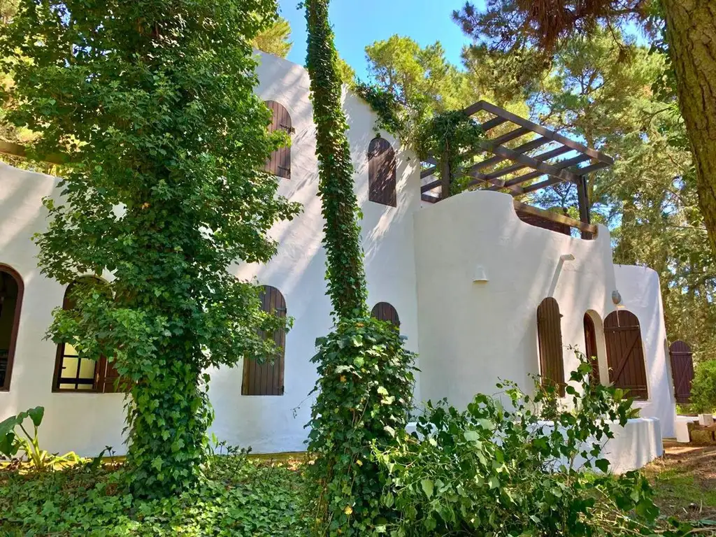 De estilo mediterráneo, con paredes blancas, aberturas de madera y detalles artesanales, esta propiedad combina el encanto rústico con la calidez del bosque.
