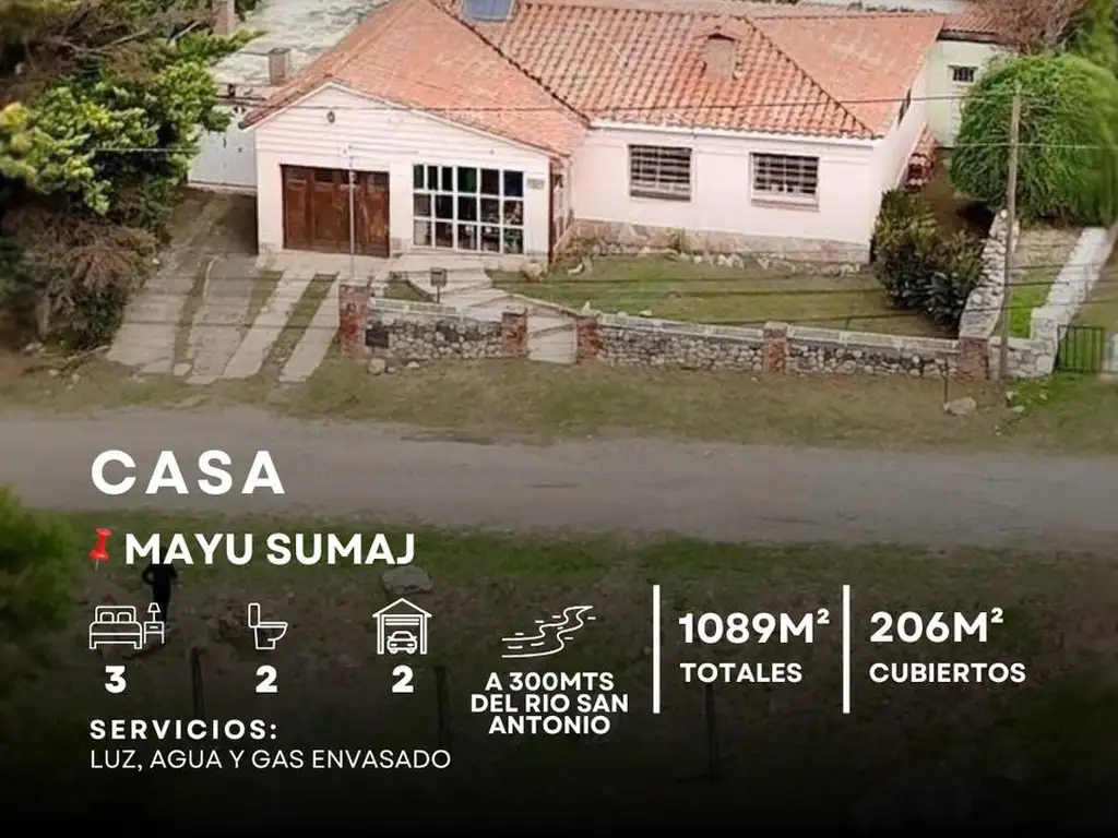 Venta de pintoresca casa encallada en las sierras Cordobesas, Mayu Sumaj, Punilla. Inmejorable ubicación, con vecinos permanentes, a 300 m del río San Antonio, y a 500 m de los Paradores. A 700 m de ruta 14. Extraordinaria vista desde todos los rincones. Cómoda y funcional vivienda, de 170 m2 cubiertos, 36 m2 semicubiertos, en un terreno de 1.089 m2. Consta de: