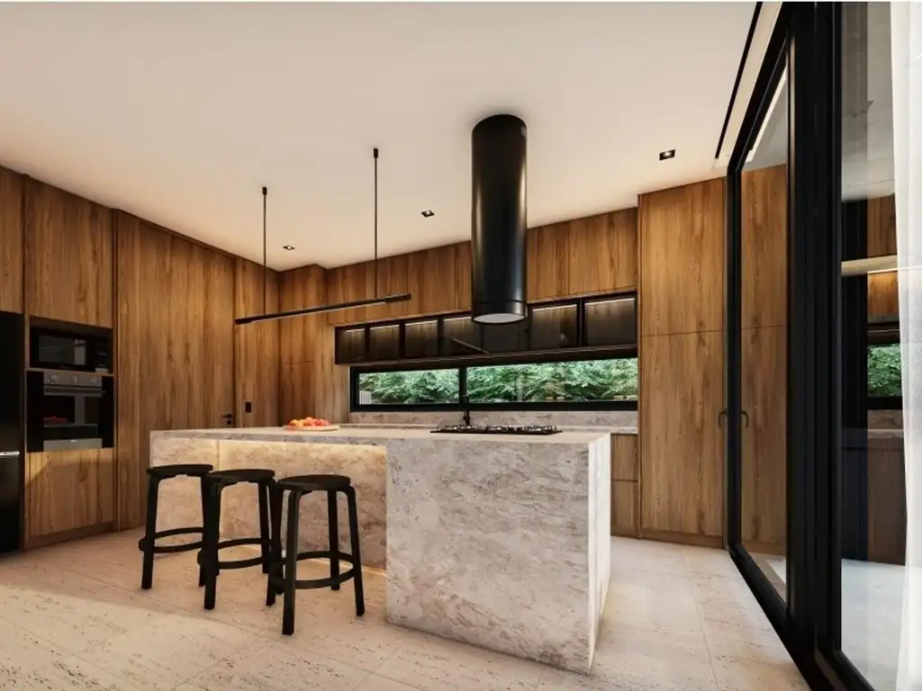 En Planta baja hall de ingreso con vistas hacia un espacio verde, toillete y placar de visitas . Doble circulación hacia sector de servicio donde se encuentra el domitorio comoleto de servicio, lavadero y este se comunica con la cocina integrada con barra de silestone . Living comedor todo con vista al jardin y piscina.