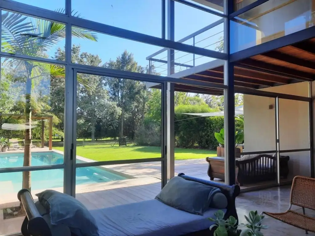 Galería con parrilla, jardín parquizado con riego por aspersión, pileta de 10 x 4 metros con cerco de seguridad para niños y solarium, creando un espacio ideal para disfrutar del aire libre y del verano con seguridad y confort.