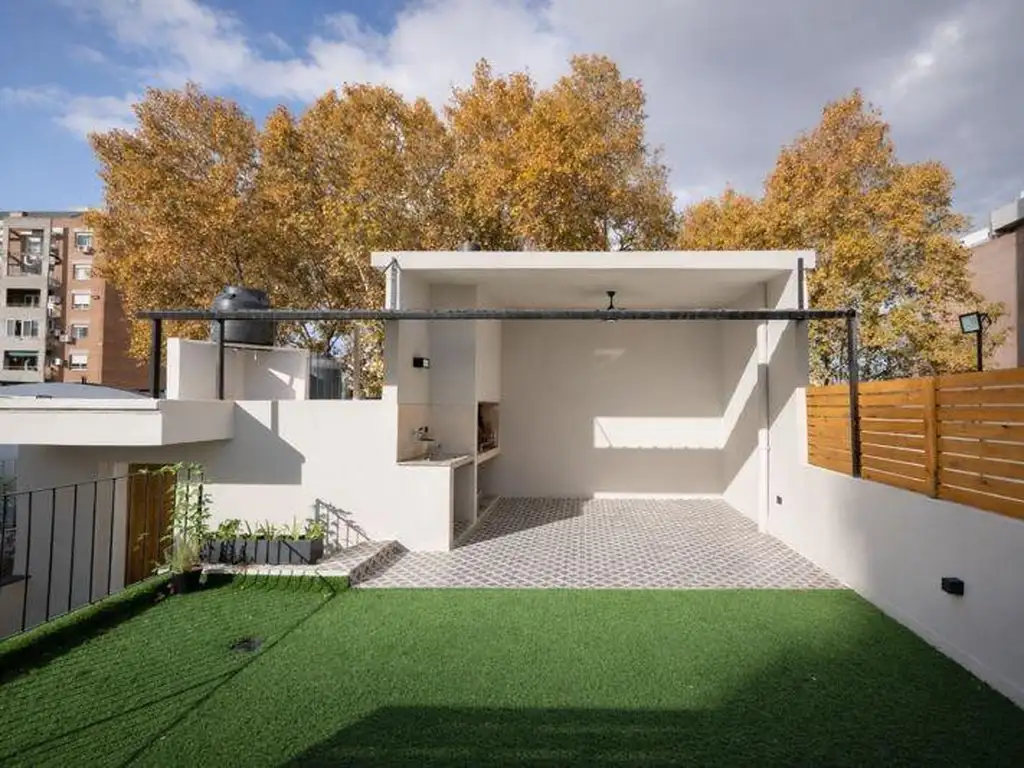 Terraza: quincho semicubierto con parrillero, mesada y bacha; terraza con césped sintético y paravistas de madera de eucalipto.