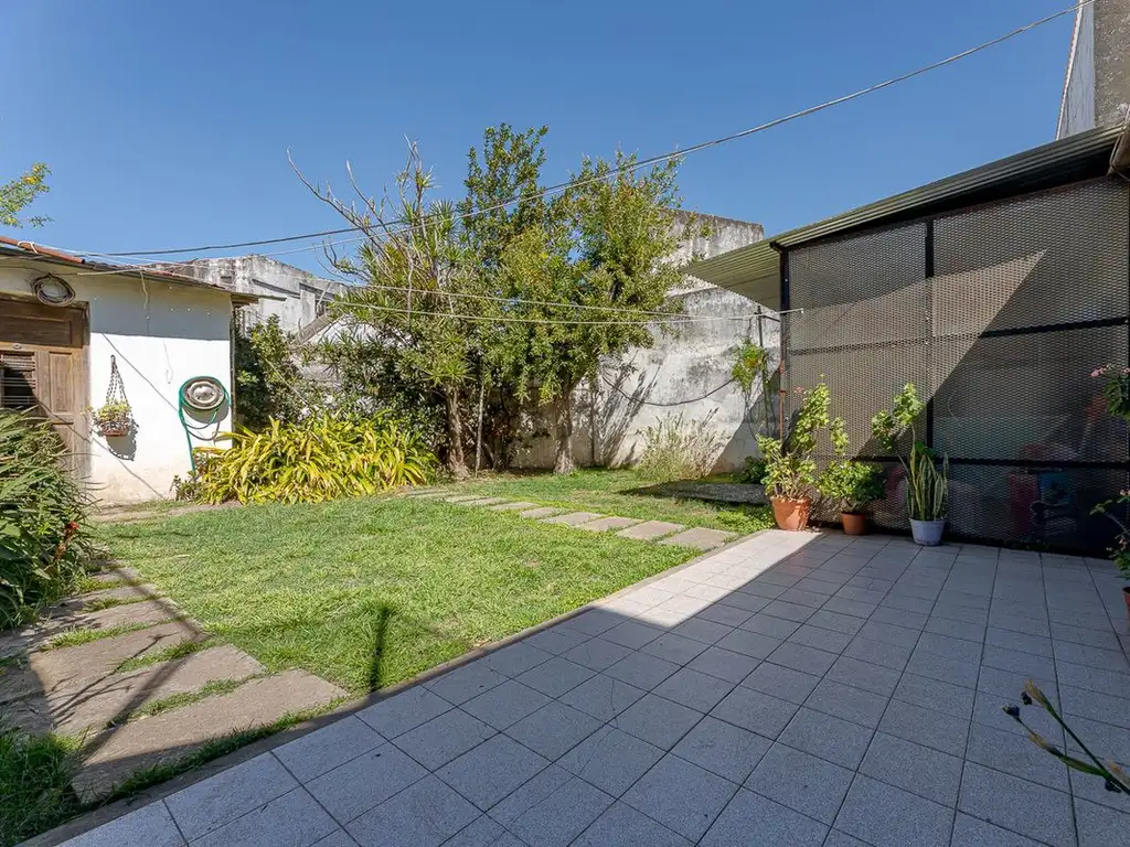 La casa cuenta con una galería techada con cerramiento liviano y otro ambiente más de guardado, previo el acceso al amplio jardín verde.