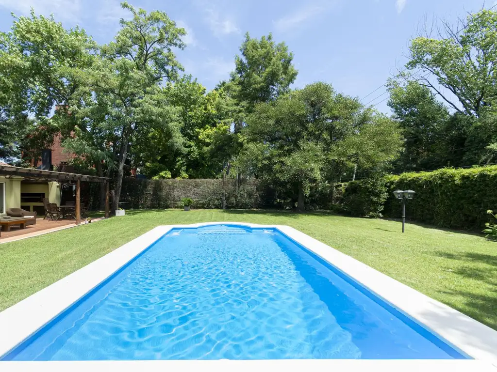 La parrilla tiene gran protagonismo por su ubicación, la pileta a la distancia justa rodeada por gran jardín.