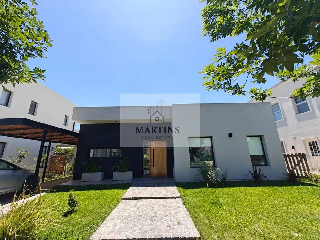 Al ingresar, se encuentra un living-comedor amplio y luminoso, con grandes ventanales que permiten una excelente entrada de luz natural y una conexión visual directa con el jardín y el paisaje. La cocina está integrada al living/comedor mediante una isla central generosa, lo que aporta un aire moderno y funcional. A su lado, un lavadero independiente, que asegura comodidad y orden. La casa cuenta con tres dormitorios, el dormitorio principal, con baño en suite, ofrece privacidad y confort. Los otros dos dormitorios comparten un baño completo. Uno de esos dormitorios incluye un espacio dedicado como escritorio, ideal para home office, estudio o simplemente un rincón de lectura.