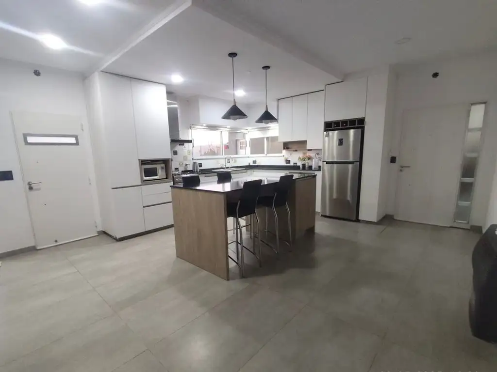 La cocina cuenta con una gran isla, equipada con mobiliario de primera calidad, integrada al living comedor de amplias dimensiones, con excelente ingreso de luz natural por ventanales con vistas al jardín con piscina orientado hacia el Norte.