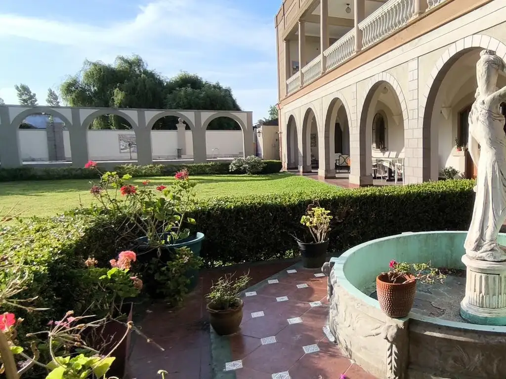 En el exterior, la propiedad cuenta con una pileta de 4 x 8 metros adornada con un mural cerámico de los Farallones de Capri. La huerta, equipada con canteros y una estatua, ofrece un espacio ideal para el cultivo de vegetales frescos.