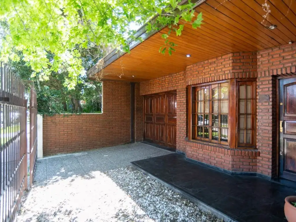 Características exteriores destacadas: garage cubierto, frente con rejas de seguridad, amplio fondo parquizado con múltiples plantas, parrilla y pileta. Monoambiente independiente con baño completo.