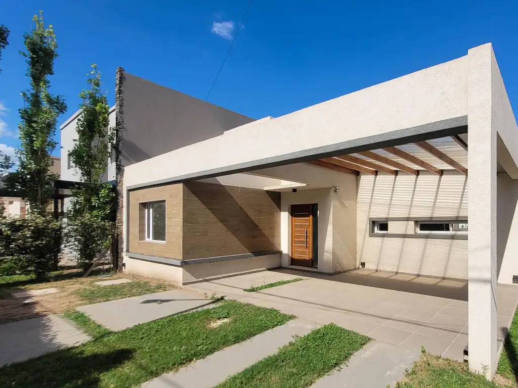 Luminosa y funcional casa ubicada en Tierra de Sueños 2. Resuelta en una planta en la que se puede disfrutar de espacios verdes tanto al frente como en su patio al contrafrente. Cochera con espacio para estacionar dos autos en comunicación directa con el ingreso principal de la vivienda.