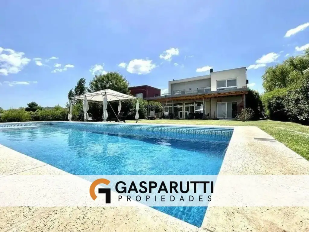 Una galería cubierta de 40 m² con sector de estar y parrilla se integra con el jardín parquizado con riego por aspersión y una piscina con vista plena al agua.
