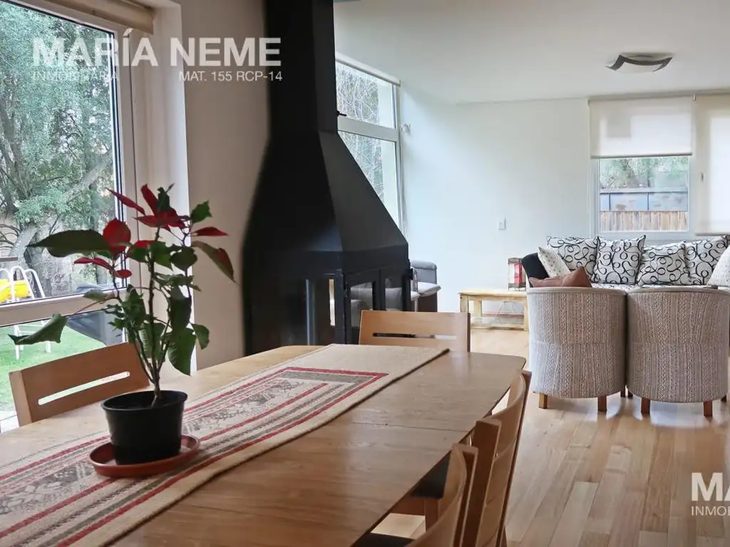 - Planta baja: Living con estufa a leña hecha con vidrios laterales de vitrocerámica, comedor con salida al deck exterior, amplia cocina integrada con barra, toilette y lavadero con salida independiente.