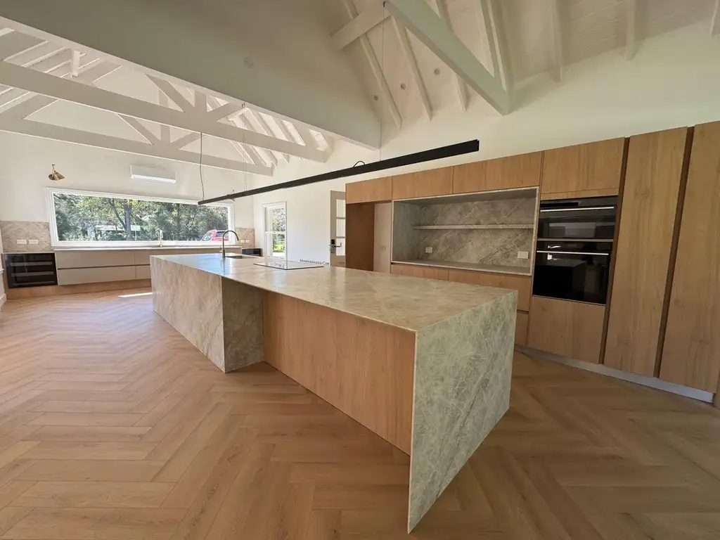 Cocina moderna con isla de piedra Taj Mahal, equipada con horno y microondas Whirlpool empotrables y anafe eléctrico de 90 cm.