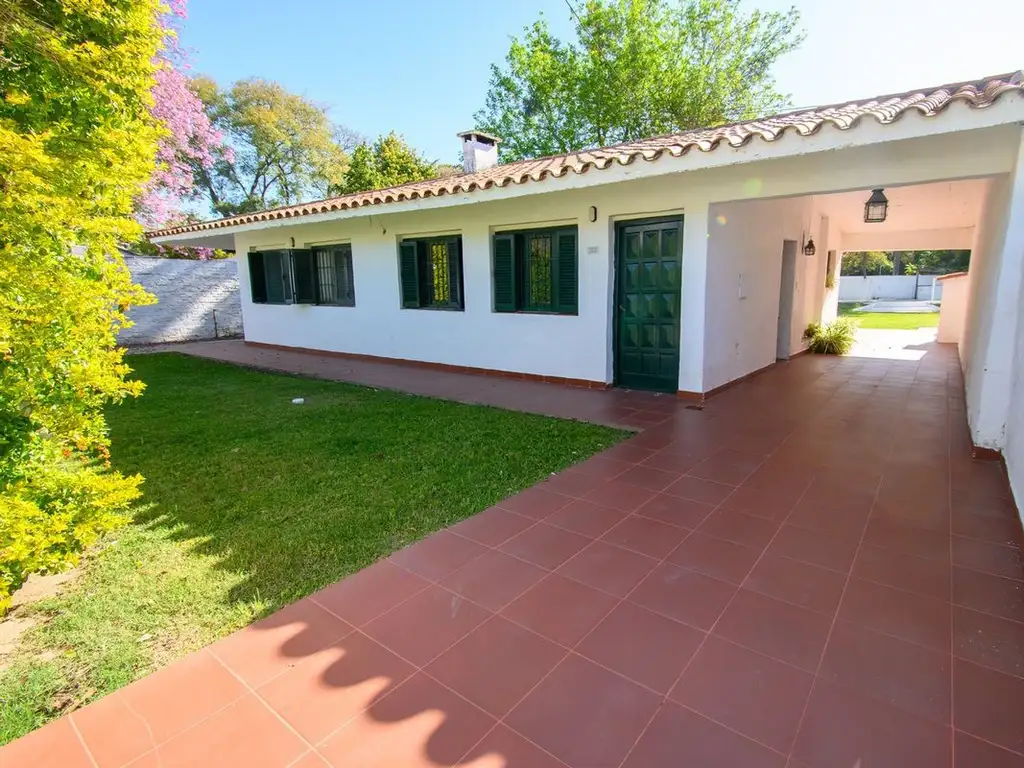 Cuenta con un amplio living-comedor con chimenea a leños, cocina semi integrada con barra desayunadora, cuatro dormitorios, tres baños completos, toilette y cocheras para varios vehículos en ambas galerías laterales.