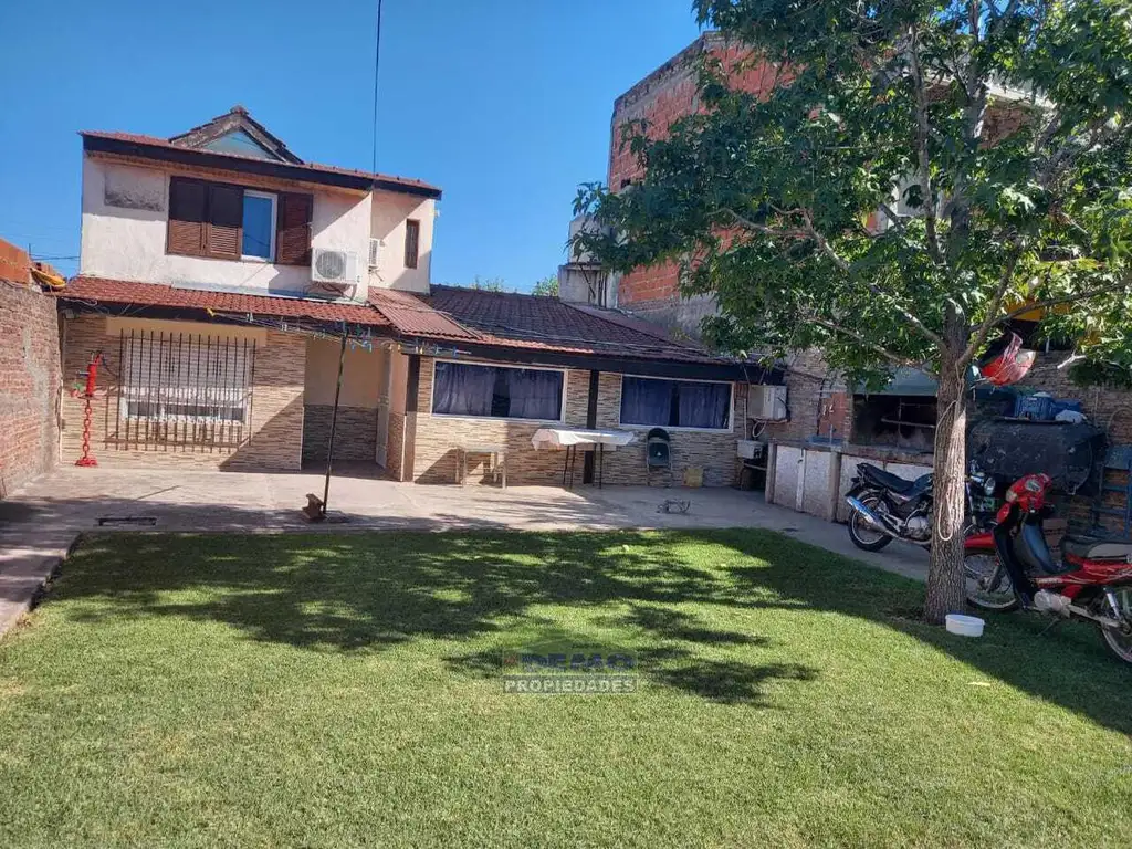 Frente con Rejas y portón vehicular corredizo, al costado Departamento con acceso independiente, Un Dormitorio, Cocina-Comedor y Baño instalado, Techo de chapa y machimbre, agua fría/caliente, Amplio parque y patio con parrilla.- Fondo casa principal en dos plantas; Planta Alta Un dormitorio con aire acondicionado frio/calor, Planta Baja con amplia galería cerrada y lavadero, Cocina-Comedor instalada, Baño completo, Dormitorio con placard a medida y aire acondicionado frio/calor.- Techo de tejas y pisos cerámicos.-
