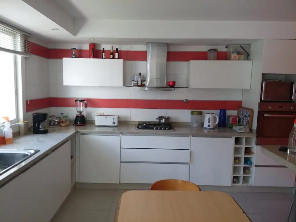 La casa principal de 5 ambientes se conforma en la planta baja de amplio living comedor con hogar, una espaciosa habitación que puede utilizarse como escritorio o dormitorio, baño principal, toilette, moderna, luminosa y amplia cocina comedor con muebles completos, lavadero, habitación de servicio, patio con jardín y parrilla y cochera para un auto. Accediendo al primer piso se encuentran 3 dormitorios todos con sus placares, equipos de aire acond. y estufas de tiro balanceado y un baño y ante baño completo. Luego desde el primer piso se accede a la terraza de la casa.