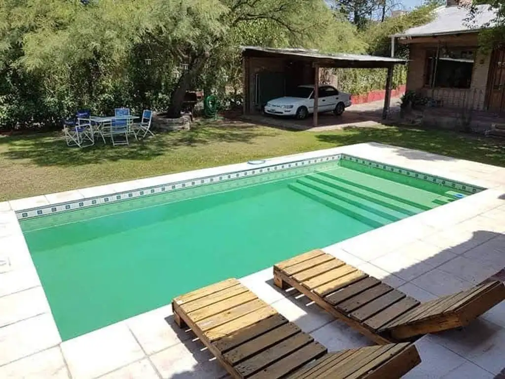 -Gran pileta rodeada de jardín