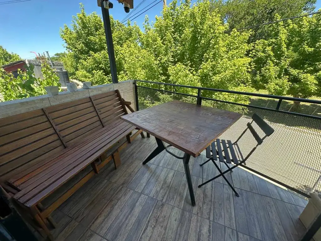 A través de una escalera interna accedemos al nivel superior, donde se desarrolla la casa principal. Al ingresar encontramos un luminoso living comedor integrado a una cocina moderna, funcional y de muy buen diseño. Desde este sector se puede salir a un balcón al frente o a una amplia galería con asador que mira hacia el patio, un espacio perfecto para encuentros, comidas y momentos al aire libre, con acceso por escalera directa al jardín.