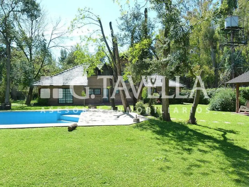 Chalet construido en dos plantas con ladrillo a la vista, ventanas de vidrio repartido en madera lustrada, techo de teja doble altura, pisos de porcelanato y grandes ambientes con un confortable hogar a leña y chimenea, todo haciendo un total de 300 m2 cubiertos sobre gran lote parquizado de 2070 m2, con un área de piscina con filtro, laja refractaria y solárium. Posee un quincho con parrilla y mesada y área de garaje múltiple, cerrado con entrada para varios autos.