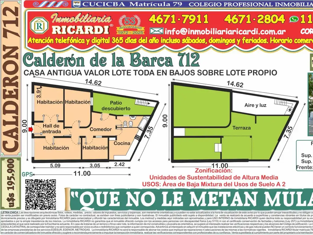 La Inmobiliaria RICARDI NO garantiza que el inmueble cumpla con el certificado de conservación de fachadas y balcones (Ley 257) tampoco efectúa el estudio de títulos, ni analiza los alcances del Código de edificación y no será responsable por los vicios ocultos o redhibitorios que competen a quien corresponda. Advertimos al adquirente que las instalaciones eléctricas, de gas natural y-o sanitarias pueden NO solo no tener un correcto y adecuado funcionamiento técnico sino que además puede NO cumplir con las exigencias actuales de METROGAS- EDESUR- EDENOR - siendo a cargo del adquirente que implique su puesta en valor y-o funcionamiento.