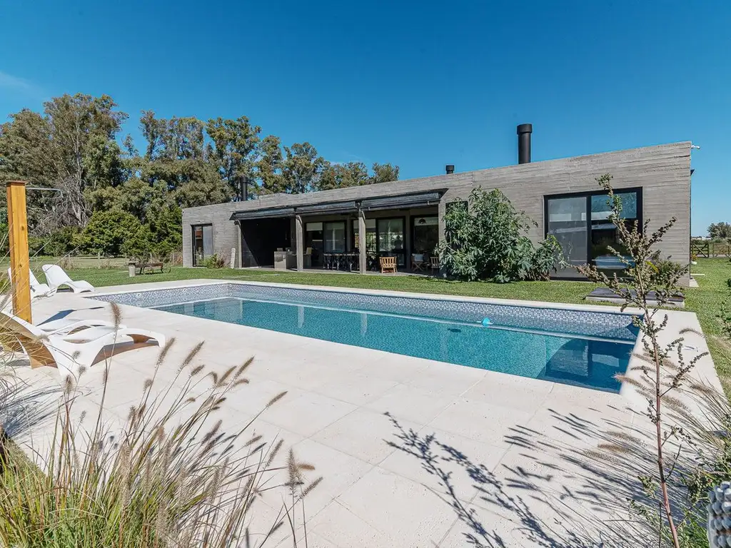 La casa cuenta con 250 m² cubiertos implantados sobre un lote de 4.800 m², ofreciendo amplitud, privacidad y vistas abiertas. Posee 5 ambientes bien distribuidos, con espacios integrados y luminosos. Cuenta con 4 dormitorios, incluyendo un dormitorio principal en suite con salida al jardín, y 3 baños completos.
