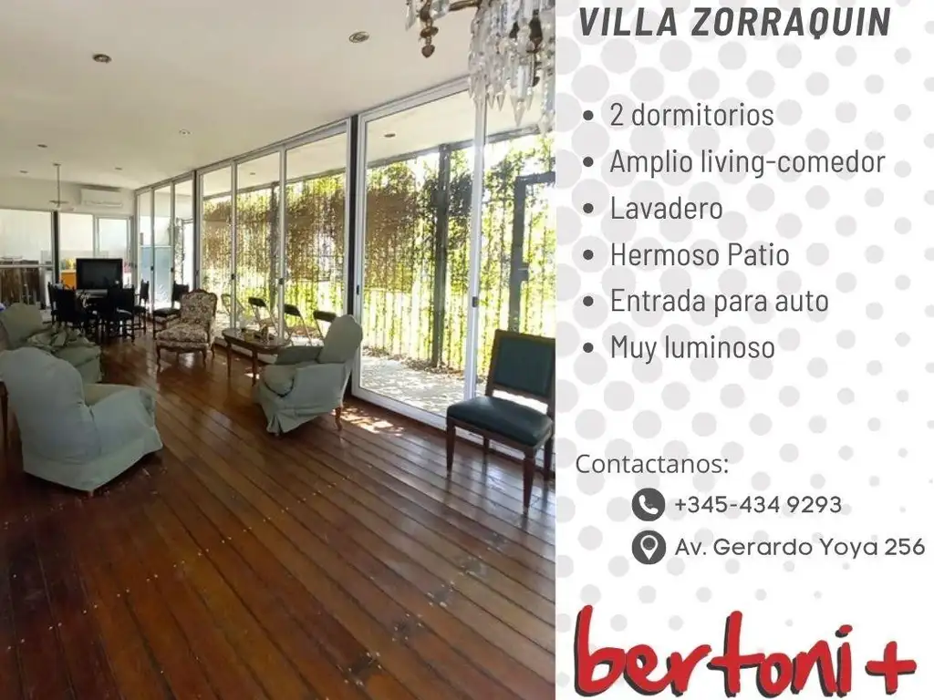 Hermosa casa ubicada en Villa Zorraquin. Amplio living comedor y estar. Cocina completa. Dos dormitorios con placard incluido. Parrilla. Jardín al frente con ingreso para auto y amplio patio al fondo. Parrilla. Rejas alrededor de toda la casa. Todas las comodidades. VALOR U$S CONSULTAR