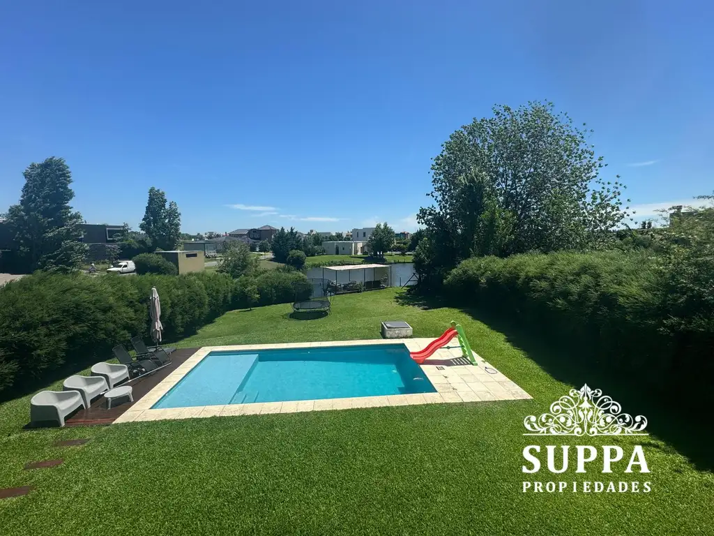 Exterior: posee una cómoda galería con parilla y barra, además de toldos automáticos que permiten extender aun mas el espacio de utilización del jardín. Gran jardín con pileta, baño exterior y muelle sobre el agua con pérgola.