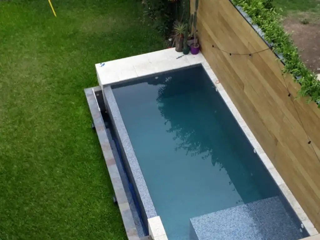 Desde el comedor y la cocina tenemos acceso a la galería de unos 5 metros x 2 y que contiene en un extremo la parrilla. Atravesando la galería tenemos la piscina, con luces, desborde lateral infinito y sistema de bombeo automatizado, revestida en venecitas tornasoladas molauf y pastina negra. Las instalaciones de la misma están preparadas para calefaccionar con cualquier artefacto, o bien con algún colector o termotanque solar.