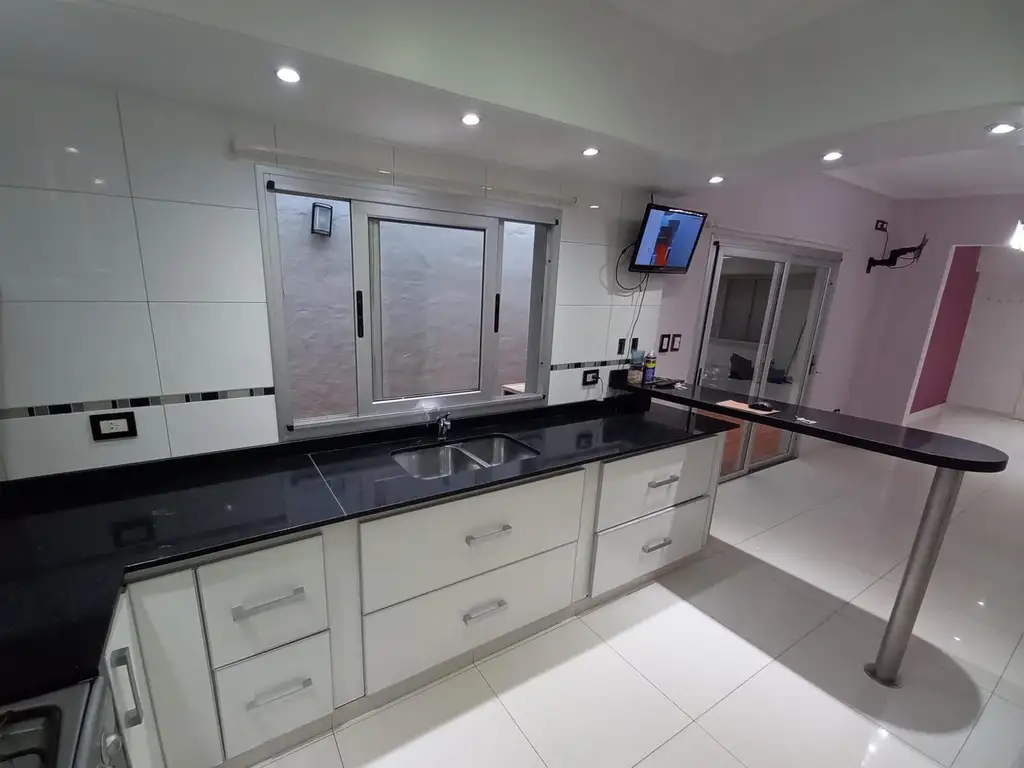 Porch de entrada; living-comedor; comedor diario; cocina; 1 baño completo con antebaño; 2 dormitorios con placard; 1 dormitorio/escritorio; patio interno tipo pulmón; garage pasante para dos autos con portón levadizo; patio; amplio quincho con parrilla, cocina y baño instalado completo.