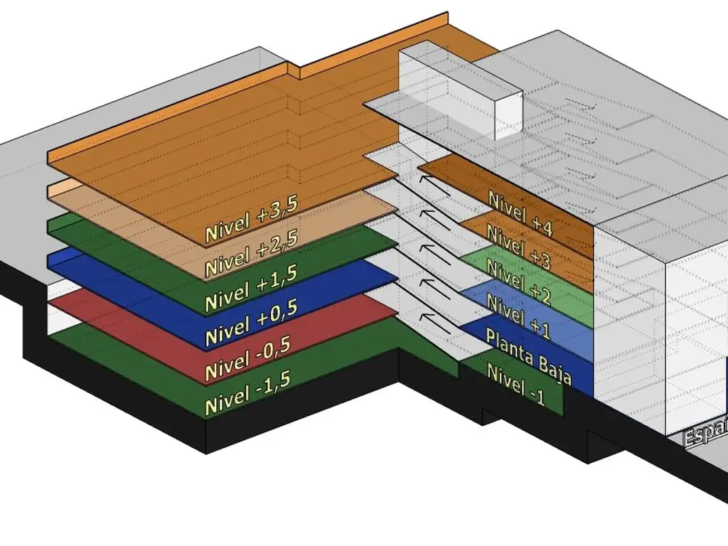 6 niveles distribuidos en 12 medio niveles: 3 bajo nivel y 9 sobre nivel, con mas de 200 cocheras.