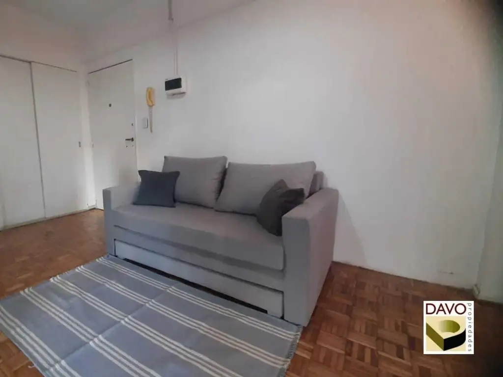 El departamento dispone de: Ambiente único con pisos de madera pulidos y plastificados, cocina separada, mesada de granito, mueble bajo mesada y alacena, lugar para heladera; La cocina es a gas nueva de cuatro hornallas con horno. Baño completo con bañera. En el estar dormitorio cuenta con un sofá cama de dos plazas y un escritorio. Un Placard de gurdado para ropa y un placard auxiliar como soporte de baño y cocina. Tiene aire acondicionado frío calor instalado.