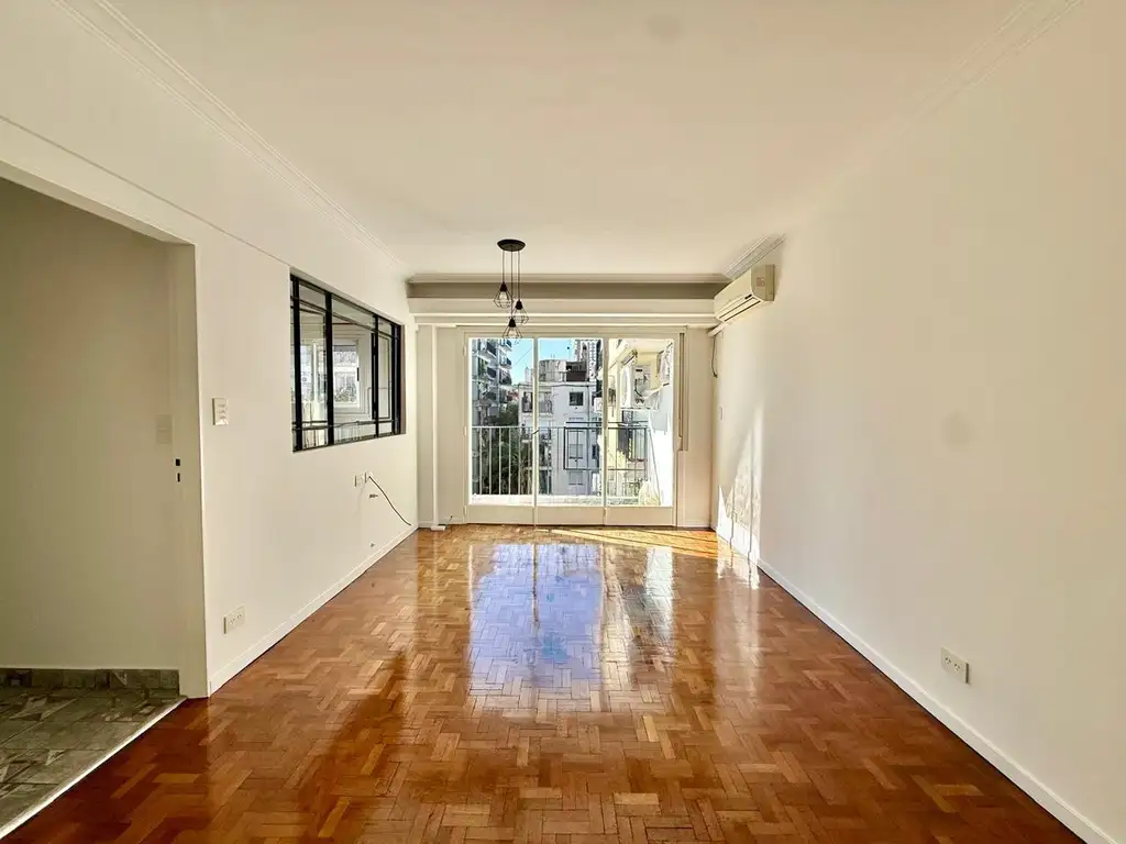 Living comedor amplio y muy luminoso, con salida a balcón al contrafrente muy silencioso y con vista abierta. Cuenta con aire acondicionado frío/calor y pisos de parquet en perfecto estado.