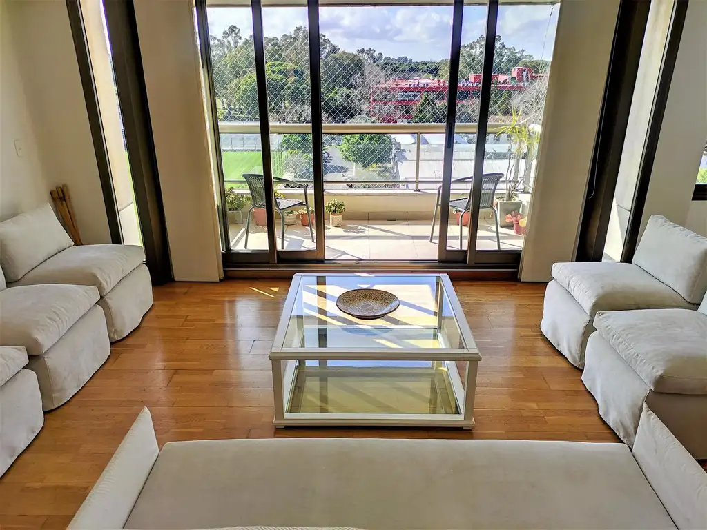 Living comedor apaisado al frente con salida a balcón aterrazado con vista abierta -