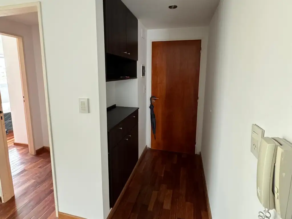 Amplio departamento al contra-frente con vista despejada. Cuenta con un recibidor con espacio de guardado, amplio living comedor, cocina semi-integrada, baño completo, balcon y dormitorio con placard empotrado. Posee cochera en el mismo edificio. Amenities: pileta y quincho.