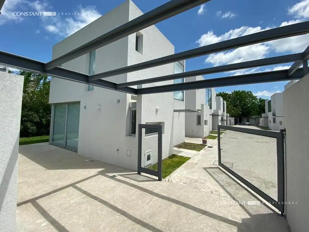 Complejo de diez unidades con ingreso compartido por puerta peatonal y portón automático. Cada propiedad cuenta con entrada para dos vehículos y espacio verde con parilla independiente.