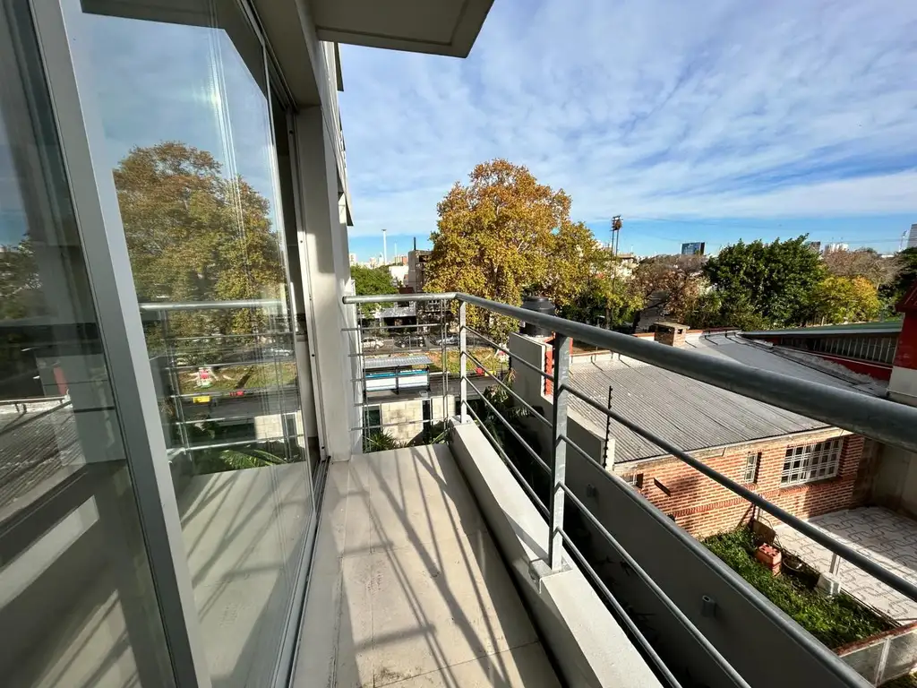 2 amplios ambientes. Moderno y luminoso living comedor con ventanales doble vidrio y salida a balcón con gran vista abierta a la ciudad y verde.
