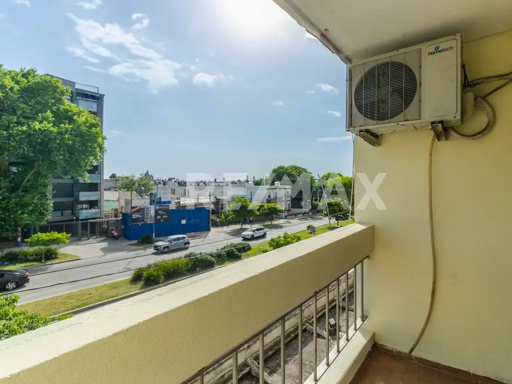 El acceso abre hacia un living comedor de 15 m², con pisos de parquet en excelente estado, aire acondicionado y ventilador de techo. La luz entra de manera directa desde el frente a través de una puerta-ventana que conecta con el balcón de 2,5 m², un espacio ideal para tomar aire, colocar plantas o simplemente disfrutar la vista hacia la avenida.