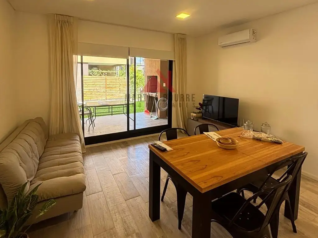 Excelente departamento 2 ambientes en planta baja con jardin, moderno y funcional. Ubicado en el barrio privado La Cañada de Pilar, complejo Cañada Village III. En la salida del km 56.5, Panamericana ramal Pilar. Este se encuentra a solo 15 cuadras del centro comercial Champagnat y a 5 minutos del Centro de Pilar. Cuenta con 3 piscinas, juegos para chicos, un SUM con cocina y parrilla, completamente amoblado y sala de juegos, ademas de una excelente ubicación y acceso. Servicios: Agua corriente, cloaca, pavimento y Seguridad 24hs. Propiedad super luminosa con excelente distribución. Amplio living comedor y cocina incorporada con todos sus artefactos, muebles en bajo mesada y alacenas. Cuenta con 1 dormitorio con placard, un baño con bañera. Galería con parrilla con bacha y espacio para lavarropa. Aire acondicionado frío/ calor en cada uno de los ambientes. Artefactos de iluminación led en interior y exterior. Cochera fija para un auto. .