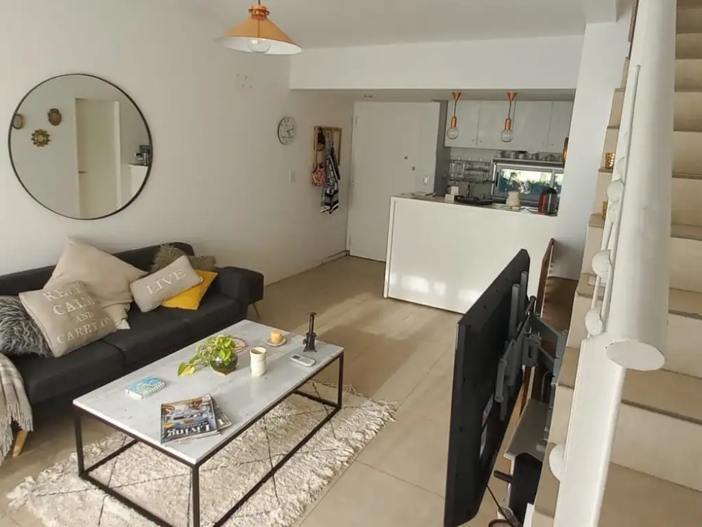 El mismo esta desarrollado en dos plantas, en la planta baja nos encontramos con un cómodo living comedor con cocina integrada separada con una barra desayunadora. Toilette de recepción y balcón con parrilla.
