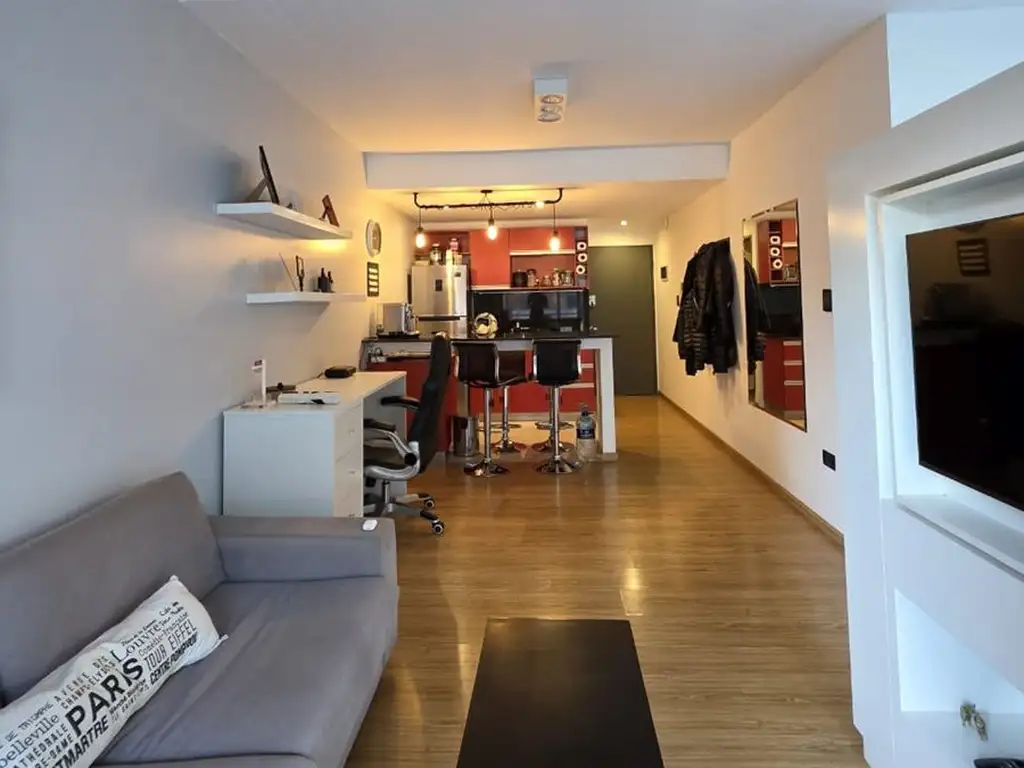 El mismo posee un toilette de recepción, cocina con desayunador, living con salida a Balcón corrido, el dormitorio se encuentra separado por un mueble divisorio que da intimidad, pero también tiene salida al balcón corrido. Baño completo.