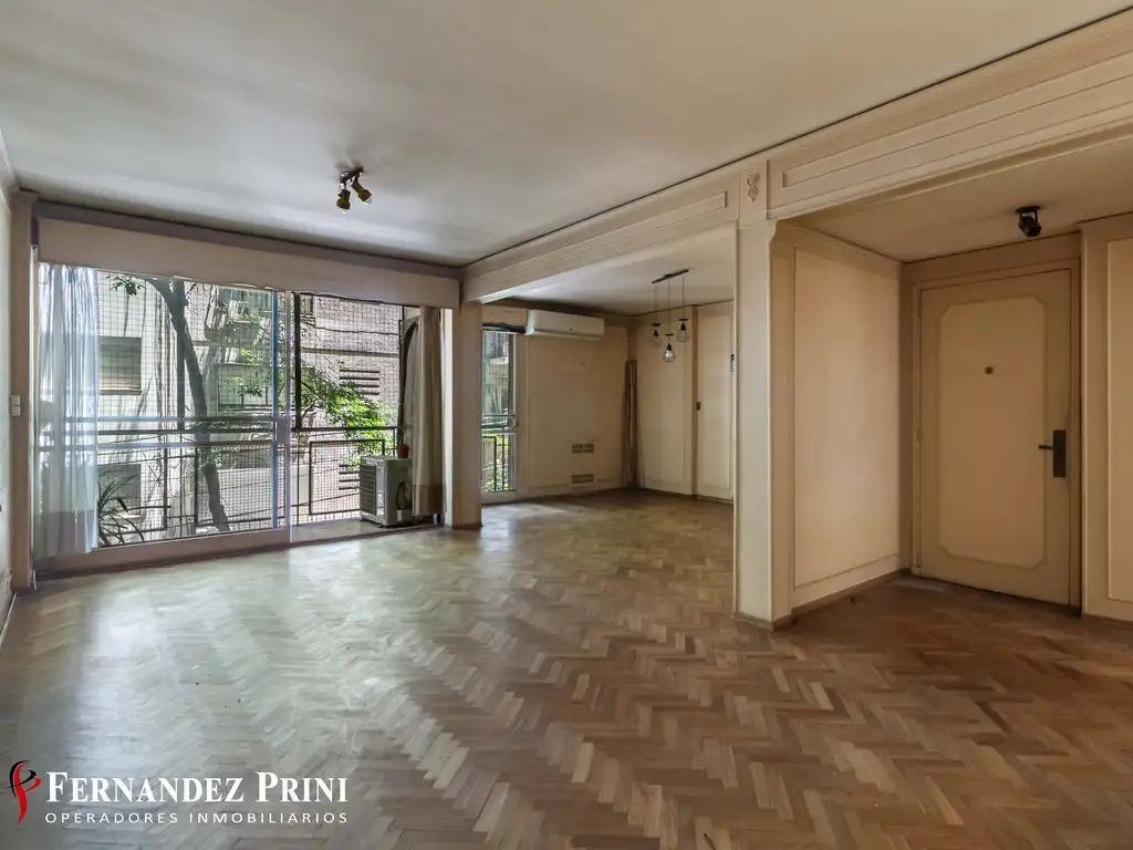 Hall de entrada, amplio living comedor con balcón. Pasillo de distribución hacia 3 habitaciones: dos de ellas al contrafrente (hacia pulmón de manzana) y uno de ellos hacia aireluz del edificio, los tres con placard. Dos baños completos. Amplia cocina con entrada de servicio, lavadero independiente y dependencia de servicio con amplio toilette