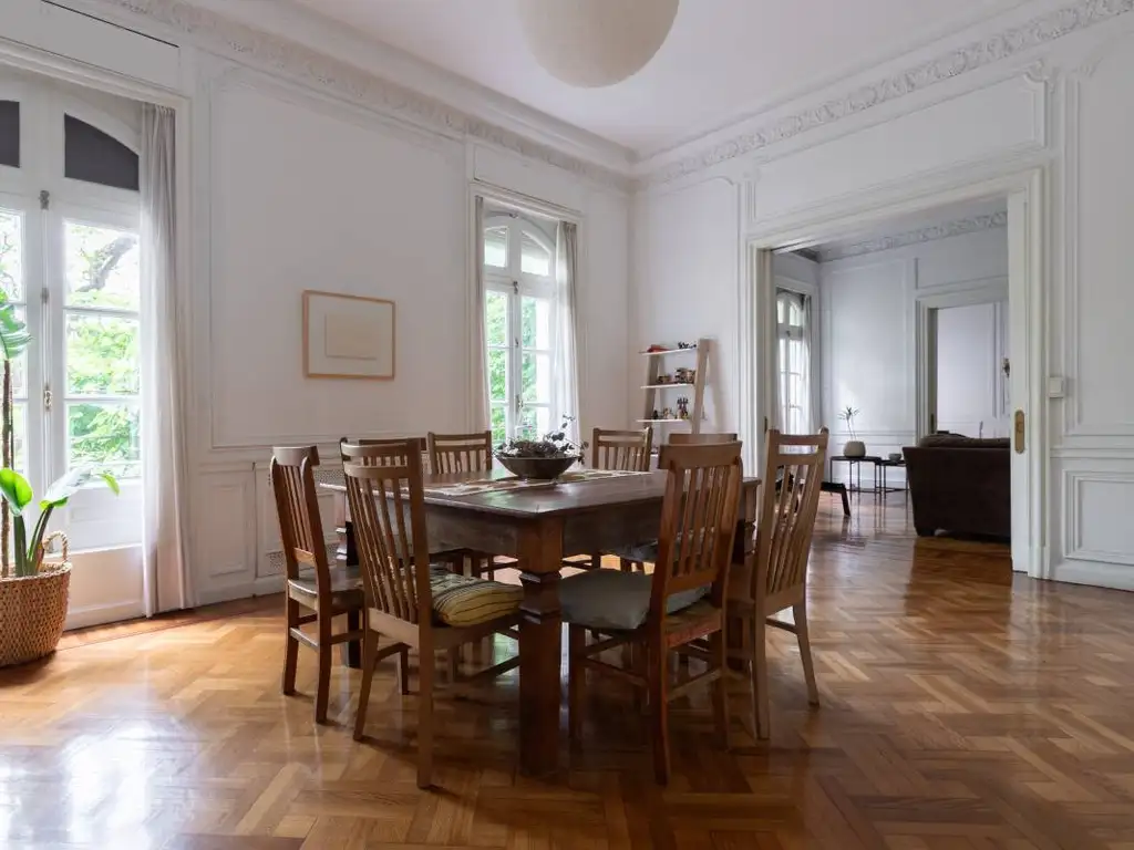 Amplio hall de entrada. Gran recepción apaisada con escritorio, living y comedor, con salida al jardín.