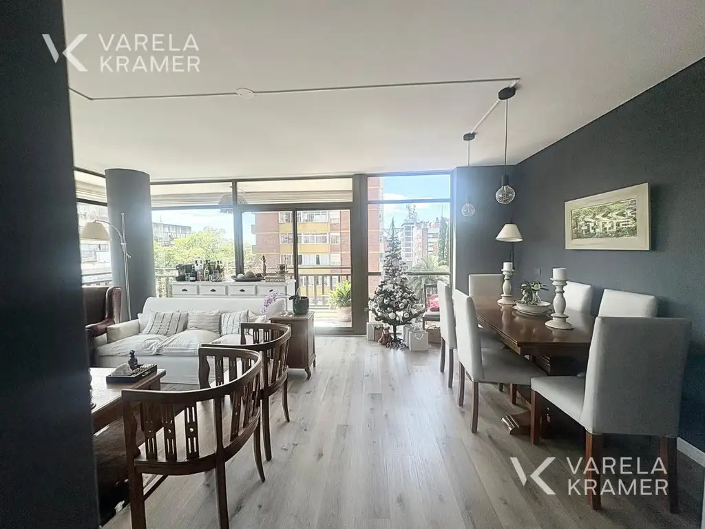 Al ingresar al departamento, nos encontramos con un cálido hall de recepción. A continuación tenemos un toilette y un luminoso y acogedor living-comedor, que cuenta con grandes ventanales orientados al noroeste, asegurando la entrada de abundante luz natural durante todo el día. El espacio se completa con un balcón en L, ideal para disfrutar de vistas al pulmón de manzana y relajarte al aire libre en un ambiente tranquilo.