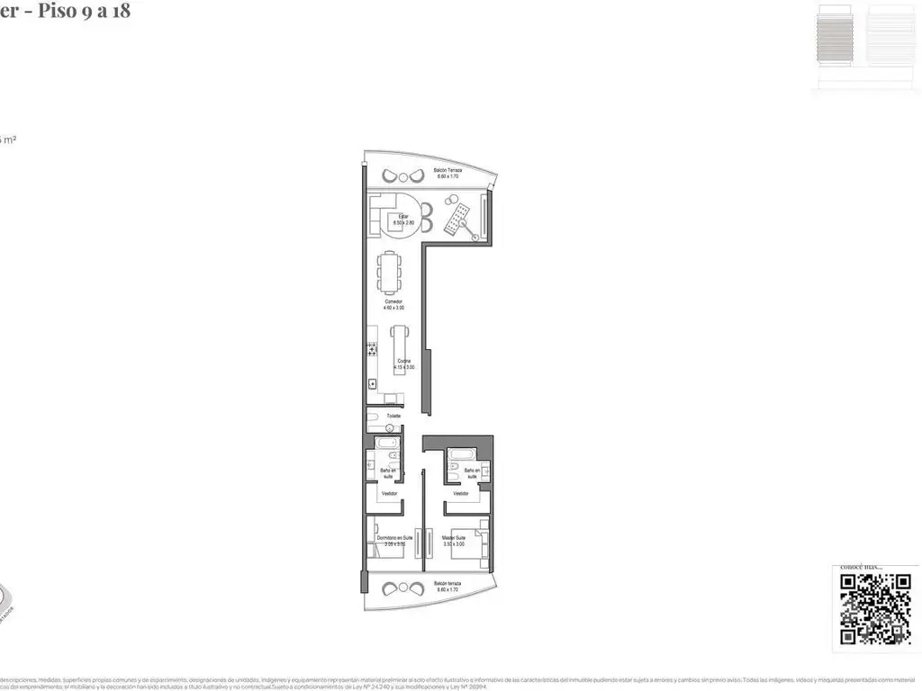 Espectacular 3 ambientes con vistas al oeste con balcón aterrazado, cuenta con el pasante living comedor con salida a balcón aterrazado, cocina integrada, 2 dormitorios en suite, el principal con vestidor y toilette de recepción.