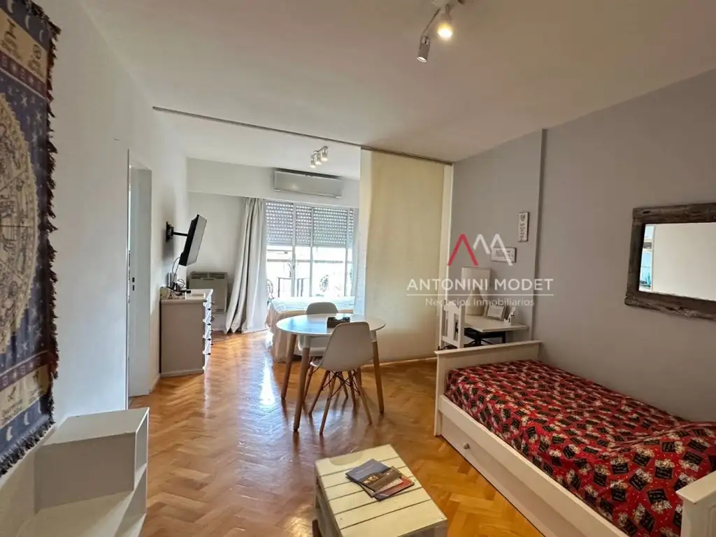 Monoambiente amplio, totalmente amoblado, con excelente distribución y posibilidad de generar una división visual mediante cortina, logrando un cómodo efecto de dos ambientes.