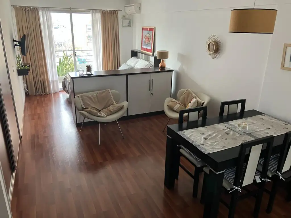 El departamento se entrega amueblado, mesa con 4 sillas, placard en la pared, somier de dos plazas , cocina completa con heladera, baño completo con bañadera, televisión de 32 pulgadas , vajilla y ropa blanca. Balcón con plantas con dimensiones de 7 metros cuadrados aproximados, con vista abierta.