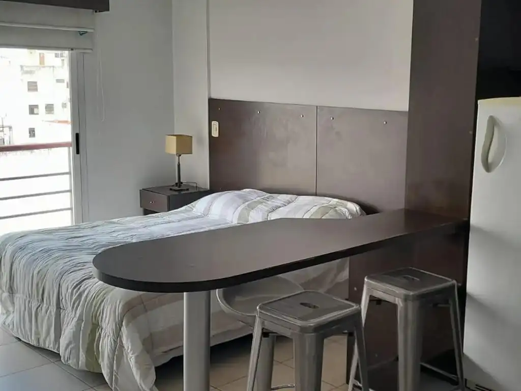 Departamento con vista abierta a la ciudad muy luminoso tipo estudio en alquiler temporario. Cercano a Metrobus a 2 cuadras, Linea C de subte a 1 cuadra y Universidades UADE y UAI.