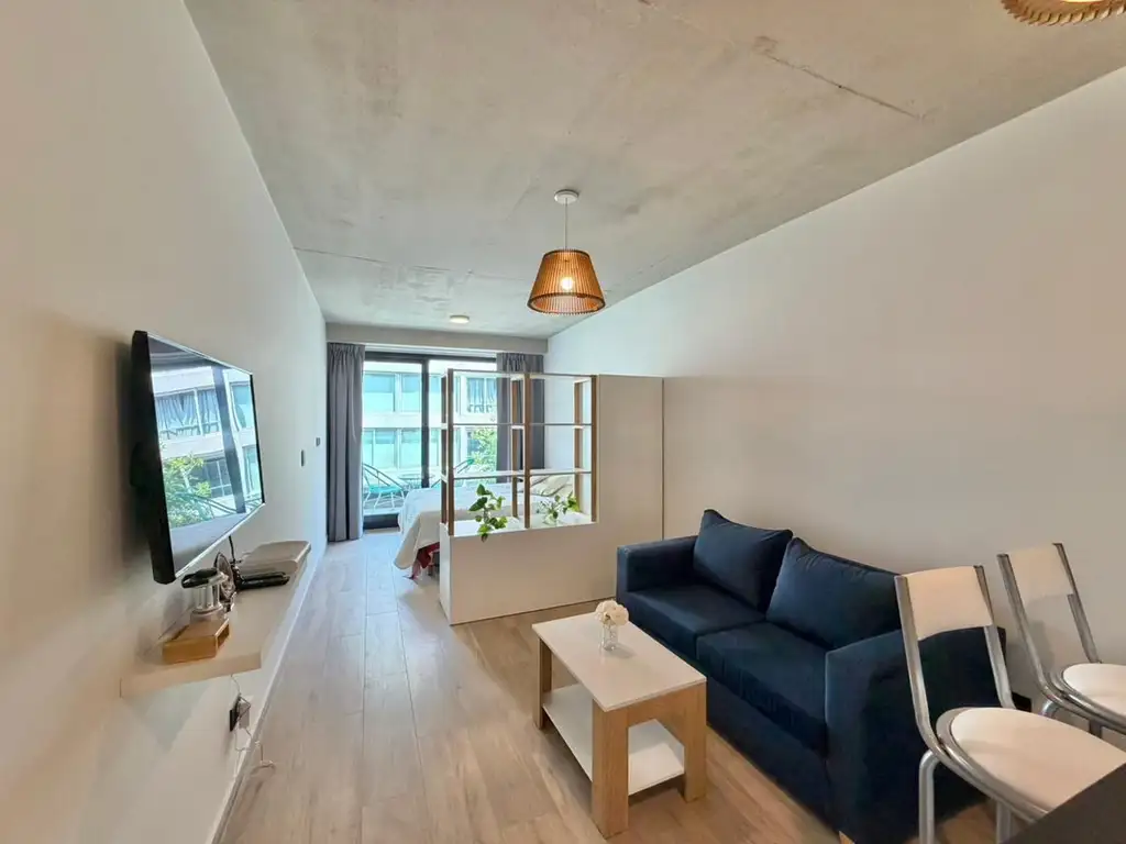 La unidad cuenta con balcón y excelente luminosidad, y se encuentra totalmente amoblada y equipada. Dispone de cama de dos plazas, mueble divisor con amplio espacio de guardado y un cómodo sector de estar con Smart TV.