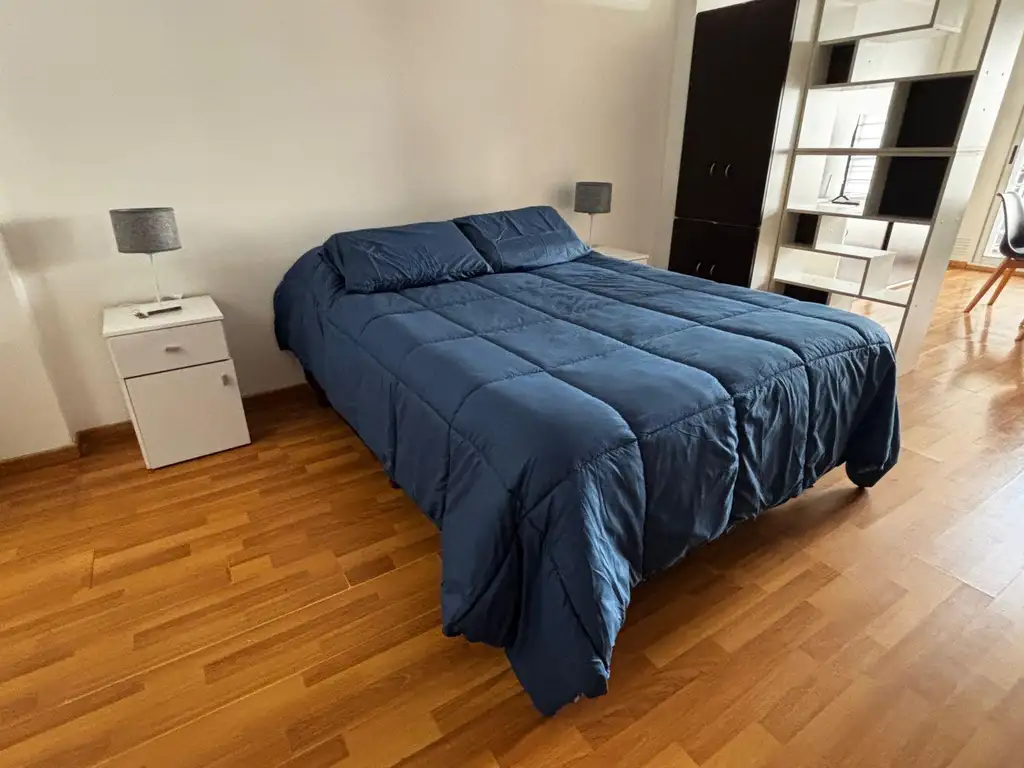 Espacio luminoso, con balcón al frente. Living cómodo con sofá y TV, cocina equipada (vajilla, microondas, heladera con freezer), dormitorio con cama de dos 2Plazas y 1/2 y amplio guardado.