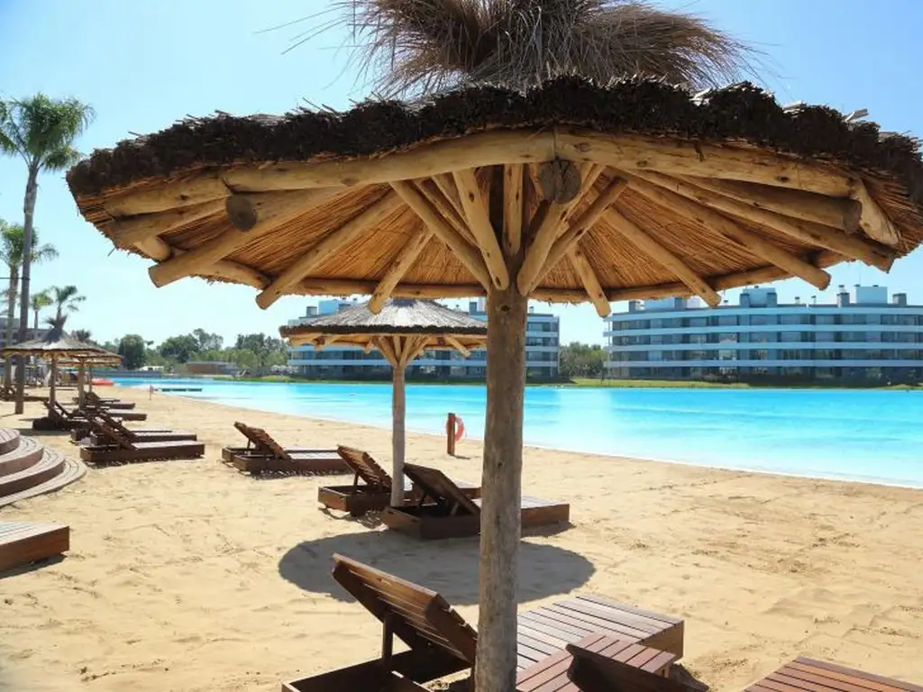 Espectacular UBICACIÓN FRENTE A LA PLAYA. Vista a la laguna cristalina de 3 hectáreas, las fotos donde se observa la laguna son sacadas desde el balcón del departamento. En la laguna se realizan actividades náuticas sin cargo mientras disfrutas de la playa de arena y palmeras. Cochera propia semicubierta. Amplio living comedor con cocina integrada, grandes ventanales, balcón terraza con parrilla, dormitorio con vestidor y vista a la laguna. Baño completo. Aire acondicionado (frio/calor) en living y habitación. Calefacción por piso radiante (caldera dual). Cocina totalmente equipada. Smart Tv