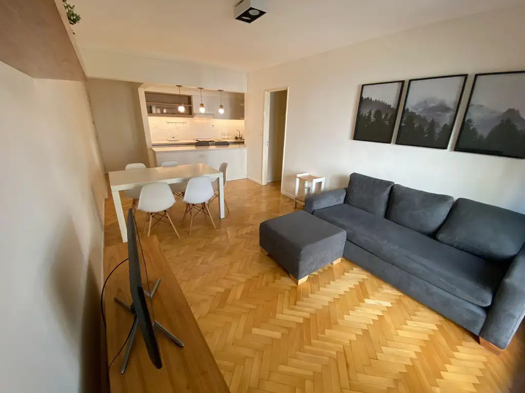 La unidad consta de un amplio comedor compuesto por juego de mesa con cuatro sillas y. living con sillon de 4 cuerpos, un rack con Tv Smart y Aire Acondicionado F/C, el mismo está semi integrado con la cocina.