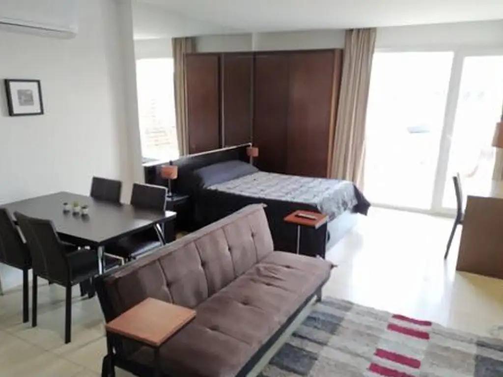 - Living comedor con cama matrimonial, sofa cama estilo tufon, escritorio y mesa con 4 sillas.